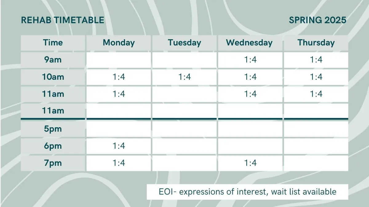 Rehab sessions will be run by our physiotherapists and will attract a rebate on private health insurance; code 560. A physio consultation is a prerequisite if you are new to the clinic to set up an individualised program, book online under 'Rehab Studio Assessment' or call us to take advantage of a free trial session to check it is right for you!